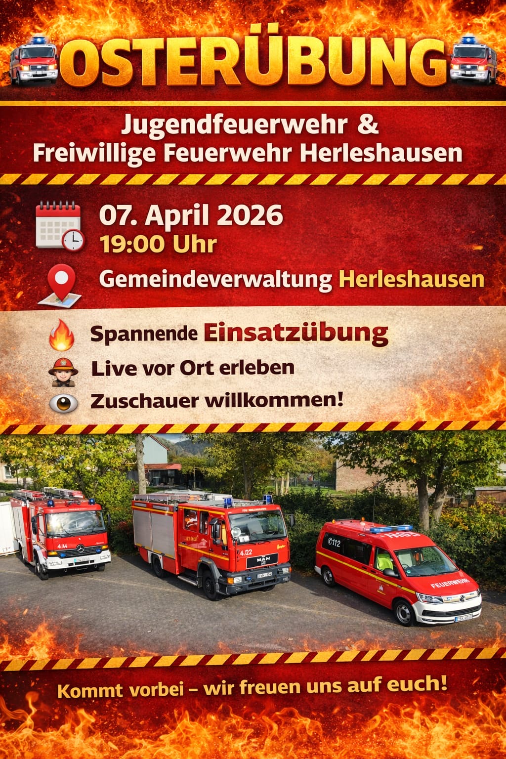 Am 07. April 2026 legen wir los: Die Jugendfeuerwehr und die Freiwillige Feuerwehr Herleshausen zeigen bei einer großen Osterübung, was sie drauf haben. Es wird eine spannende Einsatzübung, bei der ihr live dabei sein könnt – direkt vor eurer Haustür!